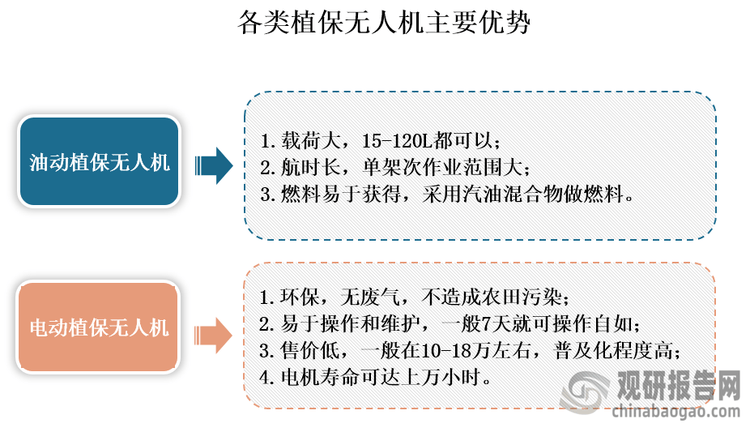 按照能源结构,植保无人机可以分为电动植保无人机和油动植保无人机等★★◆。其中,电动植保无人机具有环保、易操作、价格相对便宜等优势;油动植保无人机则具有载荷大、续航长等优势,适合大规模农业种植。