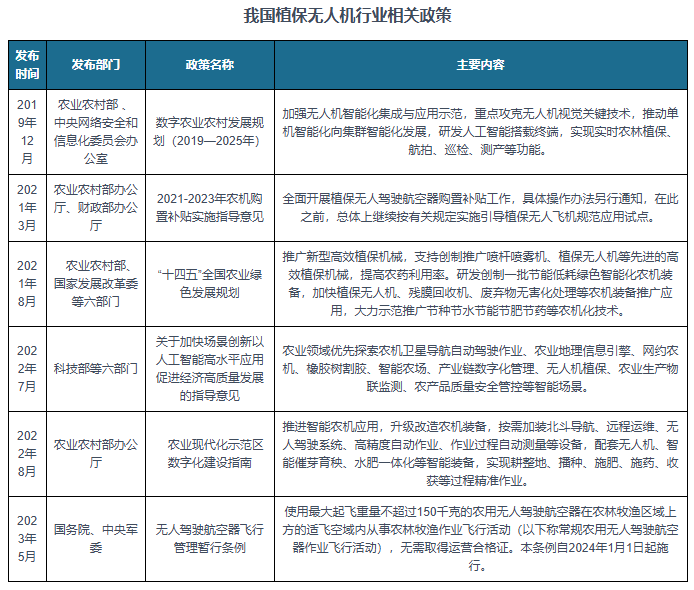 与传统植保方式相比,使用植保无人机作业不仅能够降低人工成本,还能有效减少农药在农作物及土壤中的残留◆★★★◆,具有精准施药★★、节水节药、防治效果好◆■■、安全性高等、污染少、效率高等优点。凭借这些作业优势,植保无人机行业发展一直受到国家的大力支持,近年来相继出台多项利好政策,推动植保无人机行业发展。如2021年8月农业农村部、国家发展改革委等六部门发布的《◆■“十四五”全国农业绿色发展规划》提出推广新型高效植保机械,支持创制推广喷杆喷雾机、植保无人机等先进的高效植保机械,提高农药利用率。研发创制一批节能低耗绿色智能化农机装备,加快植保无人机、残膜回收机◆■■★◆★、废弃物无害化处理等农机装备推广应用■★◆◆★,大力示范推广节种节水节能节肥节药等农机化技术。