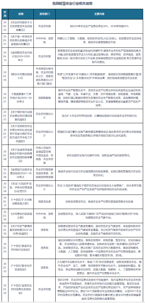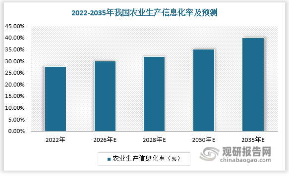 2022年我国农业生产信息化率达27.6%。《全国智慧农业行动计划(2024—2028年)》要求2024-2028年按照“一年打基础、三年见成效、五年上台阶■★■”的工作安排,分阶段推进◆★◆★■。2024年◆◆■,全面启动3大行动8项重点任务;到2026年底■★■★◆,农业生产信息化率达到30%以上◆★◆;到2028年底,农业生产信息化率达到32%以上。《农业农村部关于大力发展智慧农业的指导意见》明确指出,智慧农业是发展现代农业的重要着力点,是建设农业强国的战略制高点◆◆★◆;要求到2030年,农业生产信息化率达到35%左右■■,到2035年★◆◆■■◆,农业生产信息化率达到40%以上■◆■★,为建设农业强国提供强有力的信息化支撑。