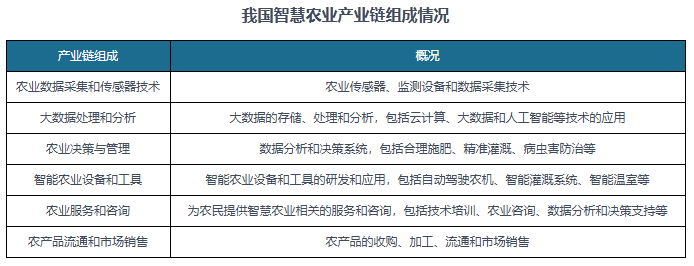 我国智慧农业产业链主要由农业数据采集和传感器技术、大数据处理和分析■■◆◆■、农业决策与管理、智能农业设备和工具、农业服务和咨询、农产品流通和市场销售六大方面组成: