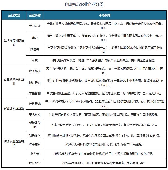 智慧农业企业可分为互联网与科技巨头◆★◆、垂直领域头部企业、农业创新型企业、传统农业企业四类◆★◆,形成多维度竞争格局◆■◆■★。以大疆农业、华为、阿里云等为代表的互联网和科技企业、以极飞科技、托普云农、丰疆智能等为代表的垂直领域头部企业通过技术突破抢占细分市场;以北大荒、新希望■◆■、温氏股份、隆平高科■★、牧原股份等为代表的传统农业龙头企业则在智慧化转型中占据重要地位。