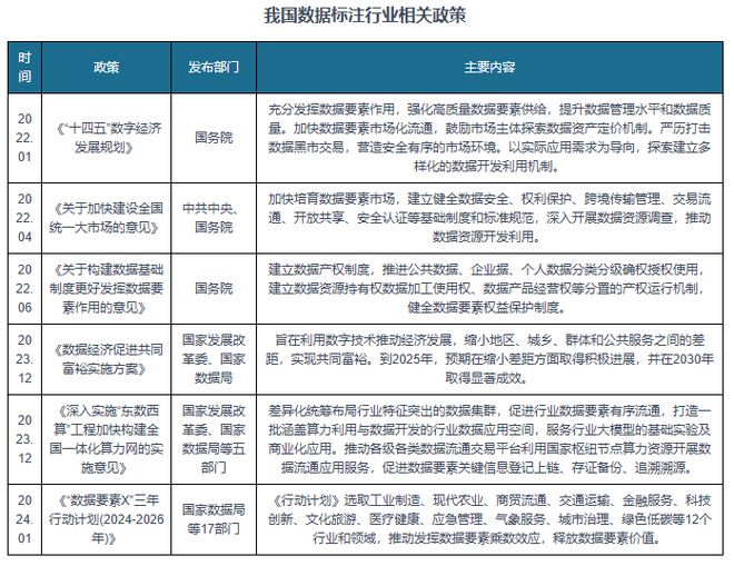 在上述政策发布以前,国家已多次出台相关政策推动数据标注行业发展。如《关于加快建设全国统一大市场的意见》提出加快培育数据要素市场■■★◆■,建立健全数据安全、权利保护、跨境传输管理、交易流通★■◆■■■、开放共享、安全认证等基础制度和标准规范,深入开展数据资源调查,推动数据资源开发利用。《“数据要素×★★★”三年行动计划(2024-2026年)》指出选取工业制造、现代农业、商贸流通、交通运输、金融服务、科技创新★■、文化旅游、医疗健康、应急管理、气象服务★★■、城市治理、绿色低碳等12个行业和领域,推动发挥数据要素乘数效应,释放数据要素价值。