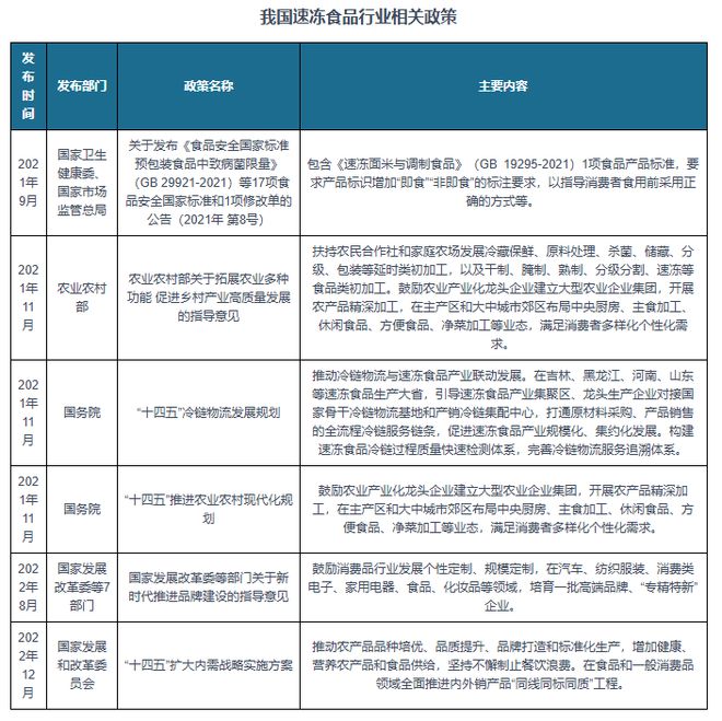 近年来,我国速冻食品行业政策环境良好,农业农村部、国务院等多个部门先后发布《农业农村部关于拓展农业多种功能 促进乡村产业高质量发展的指导意见》★◆■★、《■★■■★“十四五”冷链物流发展规划》和《“十四五”推进农业农村现代化规划》等行业相关政策■◆◆,利好我国速冻食品行业发展◆◆★■。如《“十四五”冷链物流发展规划》提到推动冷链物流与速冻食品产业联动发展★★■。在吉林、黑龙江、河南◆★■◆★、山东等速冻食品生产大省◆◆■■★■,引导速冻食品产业集聚区★★■、龙头生产企业对接国家骨干冷链物流基地和产销冷链集配中心,打通原材料采购、产品销售的全流程冷链服务链条,促进速冻食品产业规模化、集约化发展★◆。构建速冻食品冷链过程质量快速检测体系,完善冷链物流服务追溯体系。