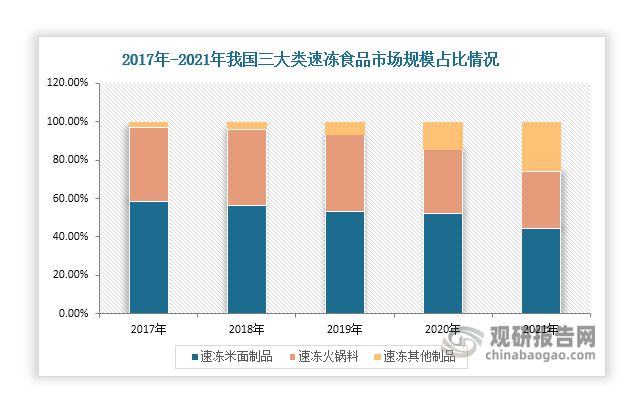 随着人们生活水平的提高和生活节奏加快,再加上冷链物流行业的推动和国家相关政策的引导和支持,近年来我国速冻食品行业发展良好,其市场规模不断扩容■◆■◆★,由2017年的1058亿元增长至2022年的1992亿元■■★★。其中,速冻米面制品是速冻食品行业最大细分市场◆★■★,但近年来其市场规模占比有所下降,由2017年的58.41%下降至2021年的44.56%;速冻菜和速冻农水畜产等速冻其他制品市场规模增长强劲,占比由2017年的2.74%增长至2021年的25◆■.81%,有望超过速冻火锅料,成为速冻食品行业第二大细分市场。