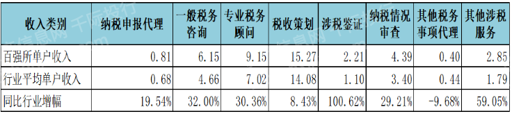 收入最大的三项业务涉税鉴证◆■、一般税务咨询★■◆、专业税务顾问◆■■◆■,合计收入108.81亿元,占百强所收入总额的67◆★■■■■.26%◆■★◆。其中◆■■★◆◆,涉税鉴证业务收入42.26亿元、占比为26.12%、同比行业低9.43个百分点;一般税务咨询收入36.38亿元、占比为22.49%、同比行业高2.22个百分点;专业税务顾问收入30.17亿元、占比为18.65%、同比行业高2◆◆■◆.77个百分点■★■■★。增幅较大的业务为专业税务顾问、税收策划、一般税务咨询,增幅分别为21.38%、20.44%、18.78%,详见图6。