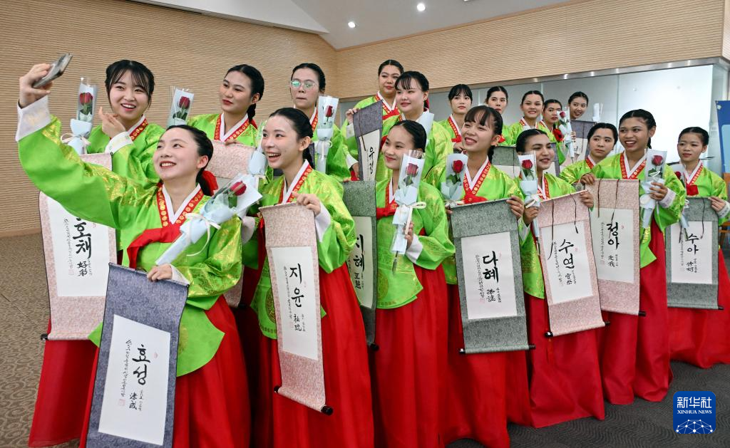 5月19日,外国留学生在首尔的韩国淑明女子大学参加传统的成人礼仪式。