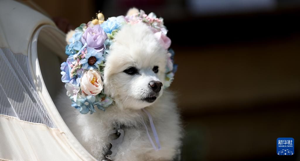 这是5月20日在英国伦敦切尔西花展上拍摄的戴着花饰的小狗。