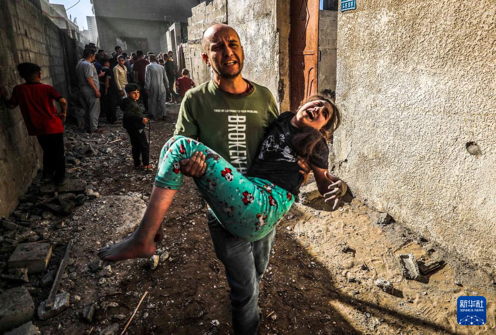 5月21日,在以军空袭加沙地带北部杰巴利耶难民营所在区域后,一名男子抱着受伤的女孩寻求救援。