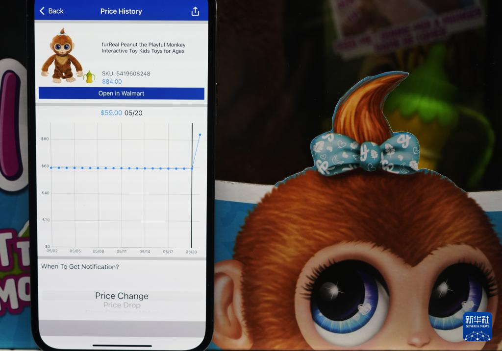 5月21日,在美国加利福尼亚州旧金山湾区圣莱安德罗的一家沃尔玛超市,价格跟踪软件显示一款中国产的毛猴玩具售价变化情况。