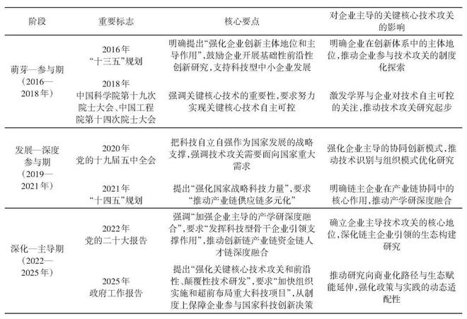 企业主导的关键核心技术攻关研究呈现出明显的阶段性特征。萌芽—参与期(2016—2018年),以技术攻关的困境诊断与机制改革为主,对应◆★◆■■★“十三五”规划中“强化企业创新主体地位■◆■”的要求◆■;发展—深度参与期(2019—2021年)◆■,聚焦技术识别机制创新与组织模式优化★◆◆◆★■,呼应2020年把科技自立自强作为国家发展的战略支撑★★◆;深化—主导期(2022—2025年),研究转向链主企业引领的协同生态构建与商业化路径延伸■★◆■★■,契合党的二十大报告提出的“加强企业主导的产学研深度融合”的部署。这一演进过程反映了学术界结合政策对企业在关键核心技术攻关中角色认知的深化★■★★,以及对复杂技术突破问题研究的逐步深入。