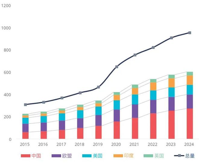 图3■★★★. AI出版物总量及趋势(前五国家/地区)(2015-2024◆■★◆■,单位:千篇)