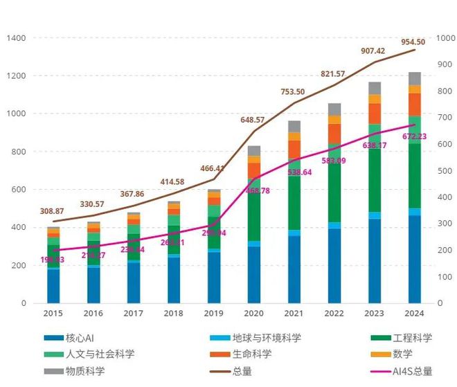 根据 自然科研智讯(Nature Research Intelligence) 提供的AI 相关出版物数量、引用量以及自然指数(Nature Index) 等多源大数据 统计显示 , 2015至2024年间◆◆■,全球人工智能 和科学智能领域的 学术 出版物总量快速 增长 ,科学智能异军突起,2020年后加速成长,有力推动了人工智能研究整体的井喷态势 ■◆。如图 2 所示,全球人工智能期刊论文数量在 过去 十年间激增近三倍——从30.8 9 万篇增至95.45万篇 ,年均增长率为14%。 人工智能核心领域(如算法★◆、机器学习) 占比 从44%降至38% ★◆★;科学智能占比相应提升了6个百分点,且其年均增长率从2020前的10%,提升至2020后的19%■★。尤其是在工程科学和生命科学领域◆◆■★,其年均增长率分别从2020年前的9%和15%,提升至2020年后的16%和29%。